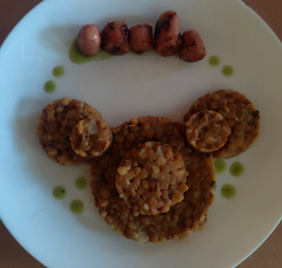 - Les salsitxes a la part superior poden representar els cabells o les celles, donant expressivitat al plat.